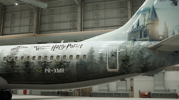 A Gol escolheu uma aeronave Boeing 737 Max, uma das mais modernas em tecnologia e sustentabilidade, para receber a adesivação temática. No desenho, representações de elementos das duas áreas temáticas do The Wizarding World of Harry Potter dentro dos parques temáticos do Universal Orlando podem ser vistas, incluindo o Castelo de Hogwarts, o Hogwarts Express, a Floresta Proibida e o feroz dragão no topo do banco bruxo Gringotts no Diagon Alley. O interior do avião também conta com uma adesivação especial para encantar os fãs em todas as etapas de sua jornada.