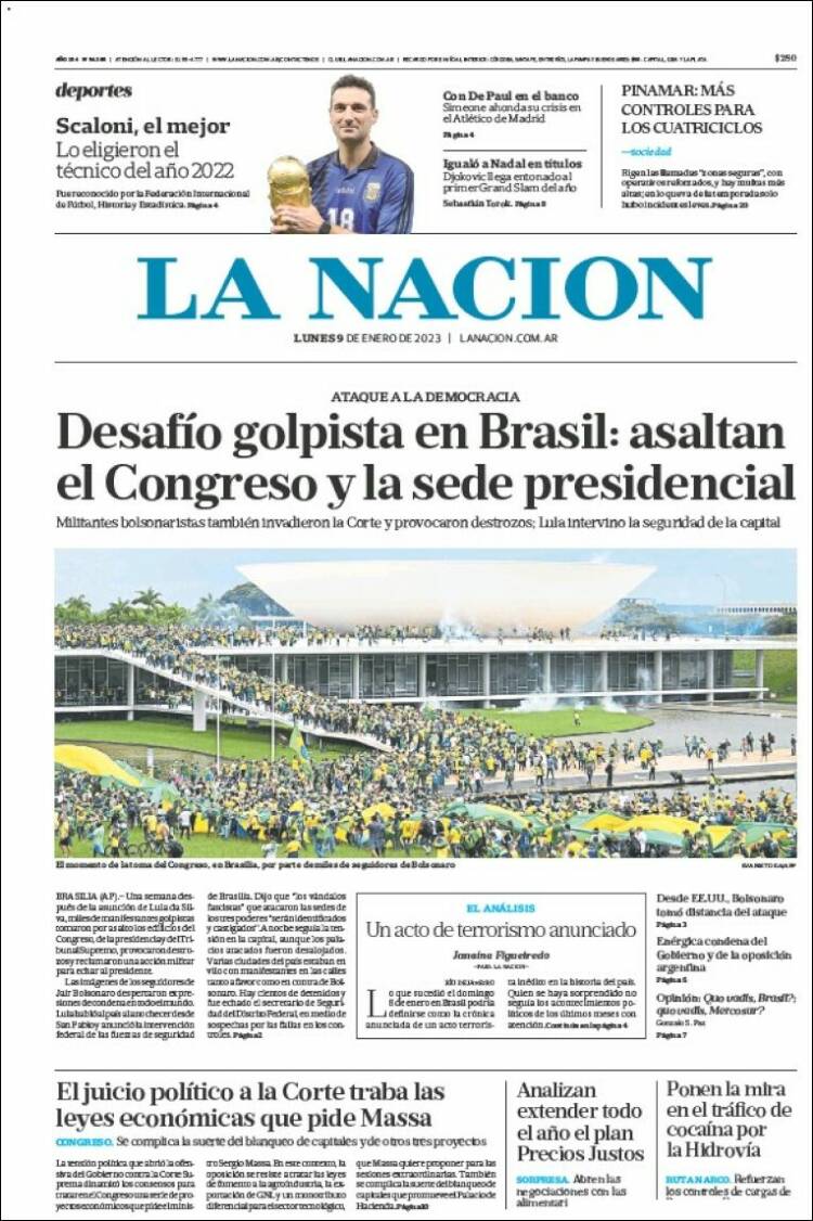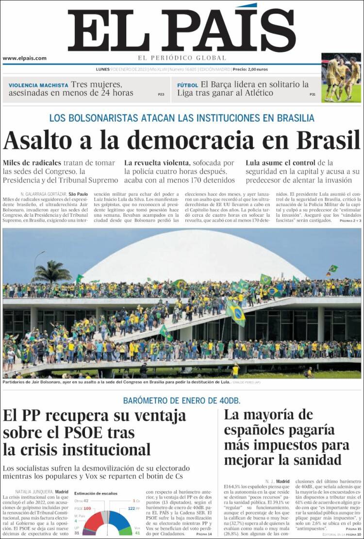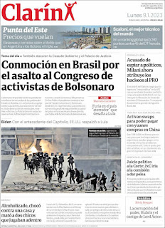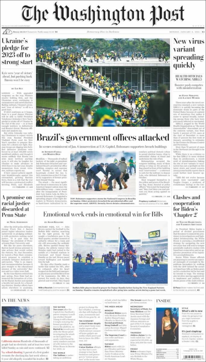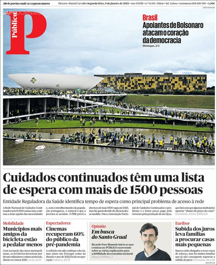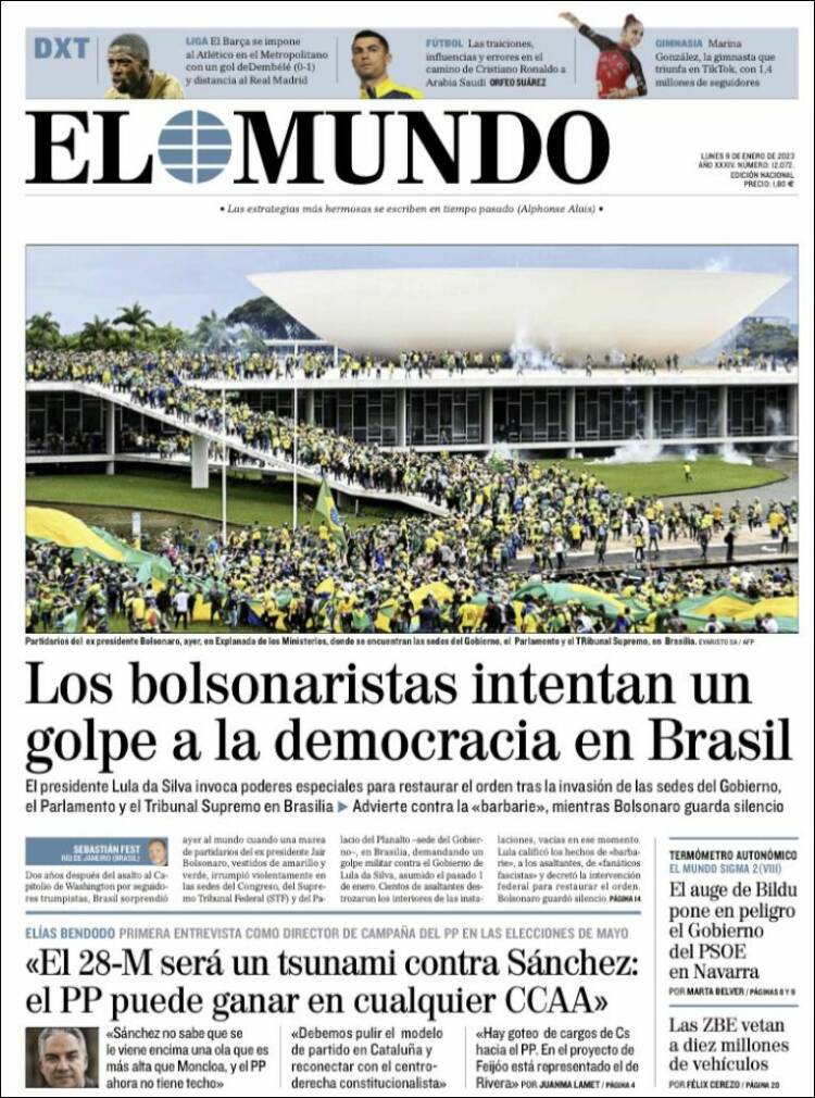 Os atos terroristas praticados por extremistas bolsonaristas neste domingo, em Brasília, ganhou grande repercussão na imprensa dos Estados Unidos, dos países da Europa e da América Latina. A invasão do Congresso Nacional, STF e Palácio do Planalto foi manchete de boa parte da imprensa estrangeira nesta segunda-feira (9). O americano The Sall Street Journal destacou: “Manifestantes pró-Bolsonaro atacam o Congresso e a Alta Corte do Brasil”. O britânico The Guardian afirmou: “Invasão no estilo do Capitólio no Brasil: apoiadores de Bolsonaro atacam Congresso”. Confira abaixo as capas dos jornais.